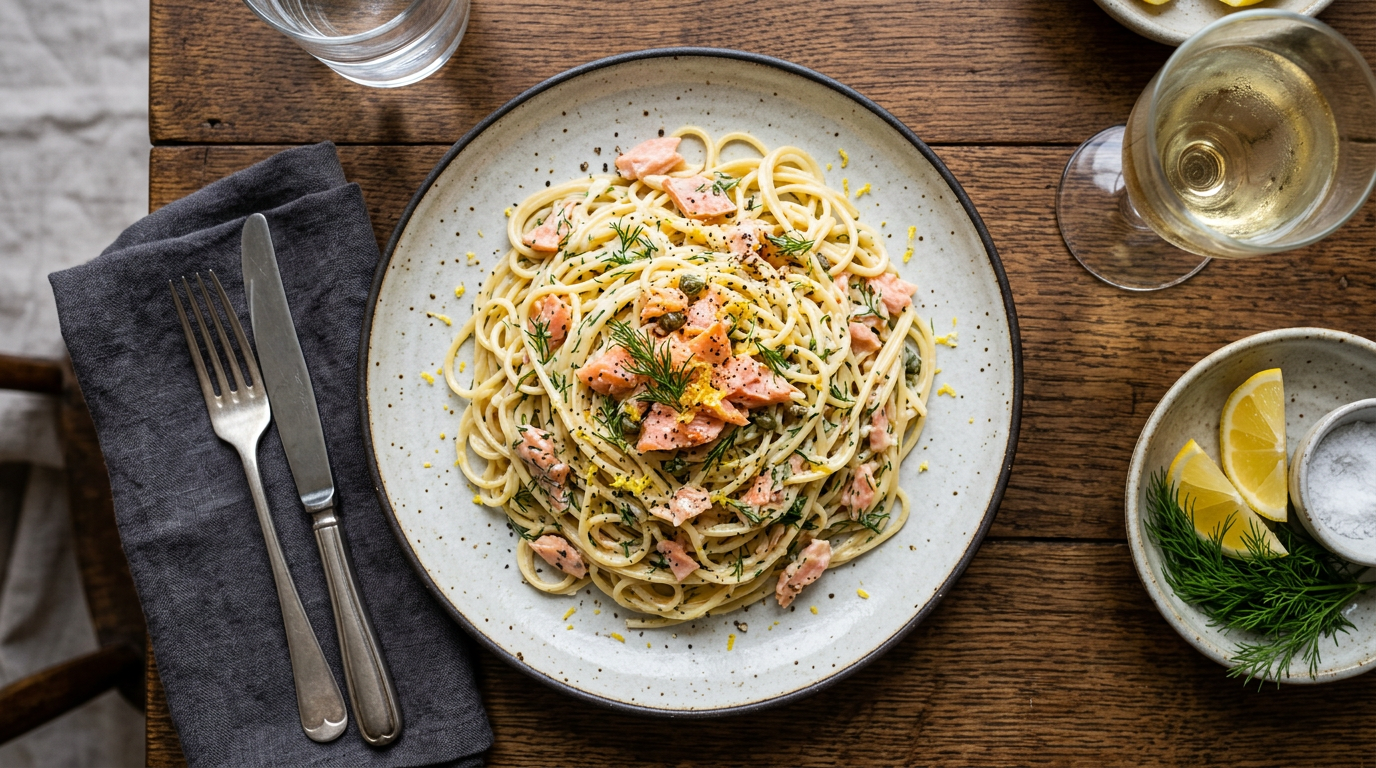 A refined yet effortless pasta dish combining the delicate flavor of smoked salmon with a creamy sauce and the refreshing aroma of lemon zest.
