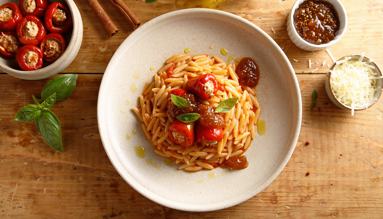 Orzo with stuffed peppadoro peppers, tomato-cinnamon sauce & fig jam